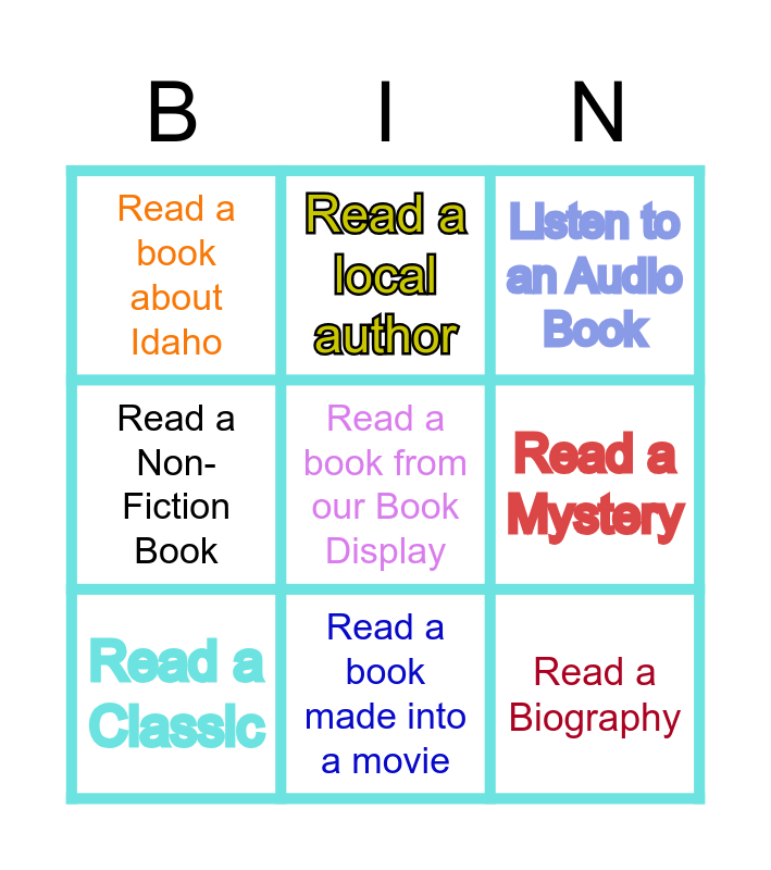 This bingo card has a free space and 8 words: Read a Mystery, Listen to an Audio Book, Read a local author, Read a Classic, Read a book about Idaho, Read a Biography, Read a Non-Fiction Book and Read a book made into a movie.