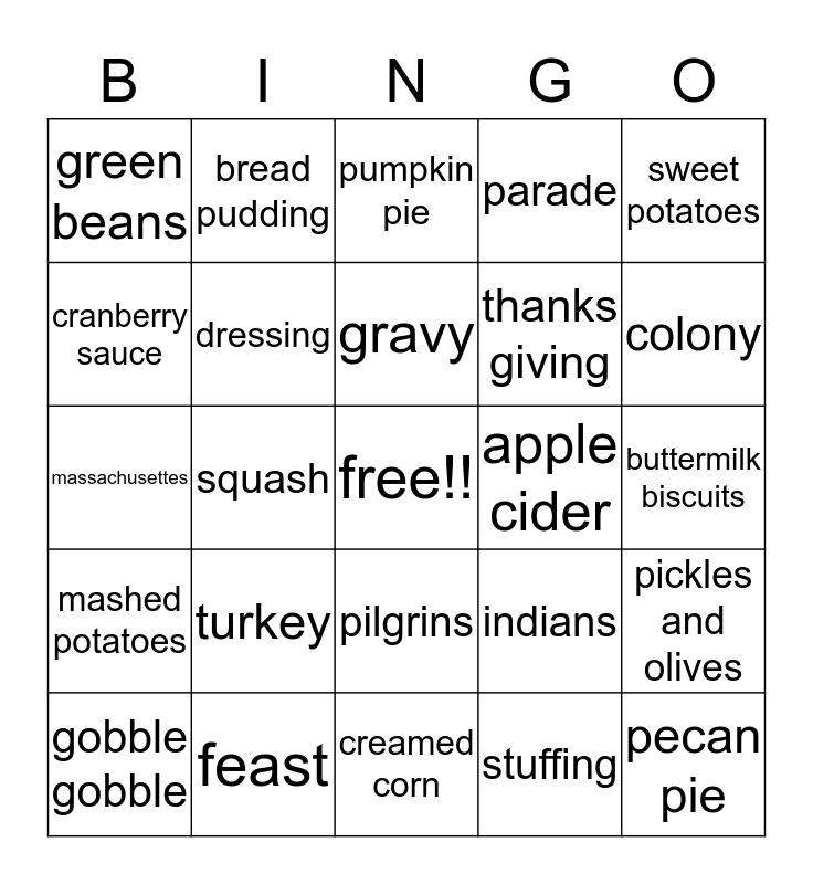 This bingo card has a free space and 24 words: turkey, feast, gravy, gobble gobble, sweet potatoes, green beans, cranberry sauce, bread pudding, apple cider, pilgrins, thanks giving, massachusettes, indians, pickles and olives, dressing, stuffing, buttermilk biscuits, pumpkin pie, colony, squash, pecan pie, mashed potatoes, parade and creamed corn.