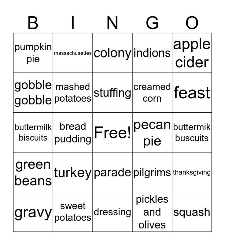This bingo card has a free space and 24 words: turkey, sweet potatoes, stuffing, gravy, apple cider, pumpkin pie, gobble gobble, massachusettes, pecan pie, parade, creamed corn, buttermilk biscuits, pilgrims, thanksgiving, mashed potatoes, pickles and olives, buttermik buscuits, colony, feast, bread pudding, squash, green beans, indions and dressing.