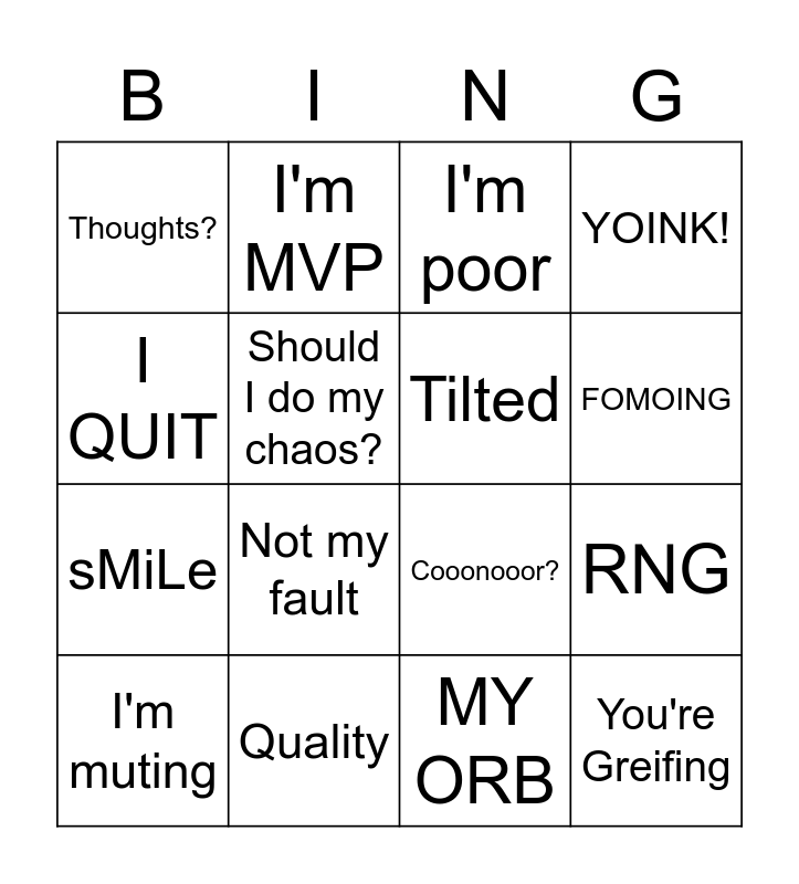 This bingo card has 16 words: Quality, RNG, I'm poor, Thoughts?, sMiLe, I'm MVP, Cooonooor?, MY ORB, I QUIT, Should I do my chaos?, I'm muting, YOINK!, Not my fault, FOMOING, Tilted and You're Greifing.