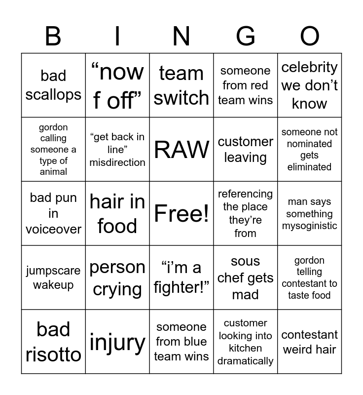 This bingo card has a free space and 24 words: person crying, injury, RAW, bad risotto, celebrity we don’t know, bad scallops, gordon calling someone a type of animal, “now f off”, referencing the place they’re from, “i’m a fighter!”, customer leaving, bad pun in voiceover, sous chef gets mad, gordon telling contestant to taste food, “get back in line” misdirection, customer looking into kitchen dramatically, man says something mysoginistic, team switch, someone not nominated gets eliminated, hair in food, contestant weird hair, jumpscare wakeup, someone from red team wins and someone from blue team wins.