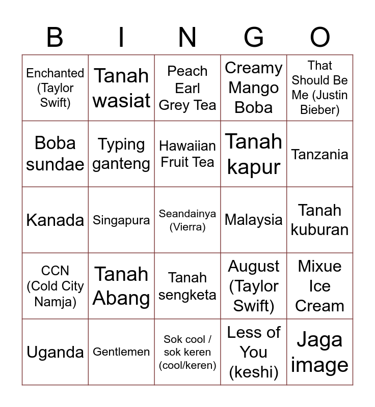This bingo card has 25 words: Tanah Abang, Sok cool / sok keren (cool/keren), Hawaiian Fruit Tea, Uganda, That Should Be Me (Justin Bieber), Enchanted (Taylor Swift), Boba sundae, Tanah wasiat, Malaysia, Tanah sengketa, Tanah kapur, Kanada, August (Taylor Swift), Mixue Ice Cream, Typing ganteng, Jaga image, Tanah kuburan, Peach Earl Grey Tea, Tanzania, Singapura, Seandainya (Vierra), Gentlemen, CCN (Cold City Namja), Creamy Mango Boba and Less of You (keshi).