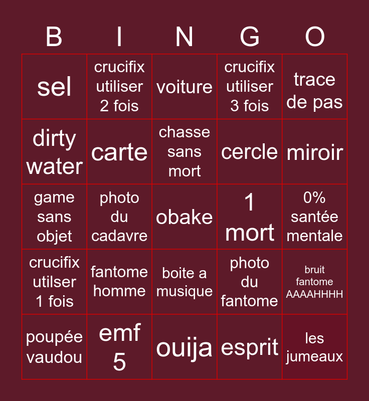 This bingo card has a free space and 24 words: poupée vaudou, fantome homme, chasse sans mort, esprit, trace de pas, sel, crucifix utiliser 2 fois, voiture, 1 mort, 0% santée mentale, game sans objet, carte, photo du fantome, bruit fantome AAAAHHHH, dirty water, emf 5, ouija, crucifix utiliser 3 fois, miroir, crucifix utilser 1 fois, photo du cadavre, boite a musique, cercle and les jumeaux.