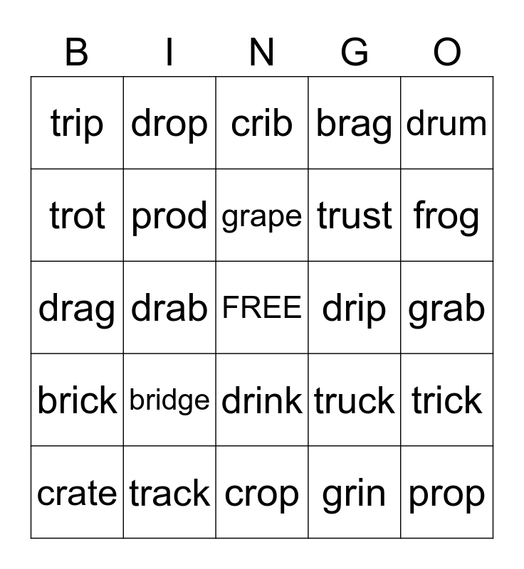 This bingo card has a free space and 24 words: bridge, track, grape, crate, drum, trip, trot, drop, drip, drink, trust, drag, truck, trick, prod, grin, grab, crib, frog, drab, prop, brick, brag and crop.