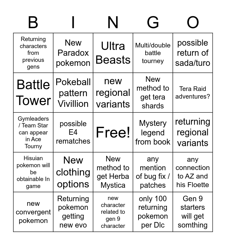 This bingo card has a free space and 24 words: New clothing options, Returning pokemon getting new evo, new regional variants, new convergent pokemon, possible return of sada/turo, Returning characters from previous gens, Battle Tower, New Paradox pokemon, Mystery legend from book, New method to get Herba Mystica, New method to get tera shards, Gymleaders / Team Star can appear in Ace Tourny, any mention of bug fix / patches, any connection to AZ and his Floette, Pokeball pattern Vivillion, only 100 returning pokemon per Dlc, returning regional variants, Ultra Beasts, Tera Raid adventures?, possible E4 rematches, Gen 9 starters will get somthing, Hisuian pokemon will be obtainable In game, Multi/double battle tourney and new character related to gen 9 character.