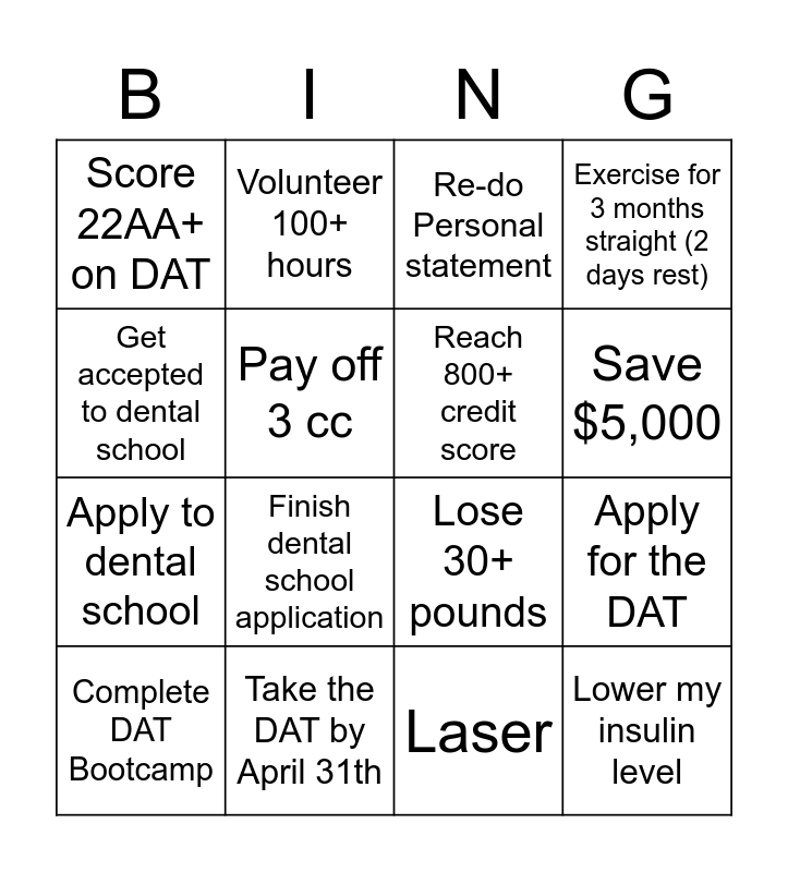 This bingo card has 16 words: Take the DAT by April 31th, Apply for the DAT, Re-do Personal statement, Score 22AA+ on DAT, Apply to dental school, Volunteer 100+ hours, Lose 30+ pounds, Laser, Get accepted to dental school, Pay off 3 cc, Complete DAT Bootcamp, Exercise for 3 months straight (2 days rest), Finish dental school application, Save $5,000, Reach 800+ credit score and Lower my insulin level.