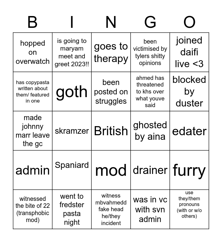 This bingo card has a free space and 24 words: Spaniard, went to fredster pasta night, been posted on struggles, witnessed the bite of 22 (transphobic mod), joined daifi live <3, hopped on overwatch, has copypasta written about them/ featured in one, is going to maryam meet and greet 2023!!, ghosted by aina, mod, ahmed has threatened to khs over what youve said, made johnny marr leave the gc, drainer, furry, goth, was in vc with svn admin, edater, goes to therapy, blocked by duster, skramzer, use they/them pronouns (with or w/o others), admin, been victimised by tylers shitty opinions and witness mbvahmedd fake head he/they incident.