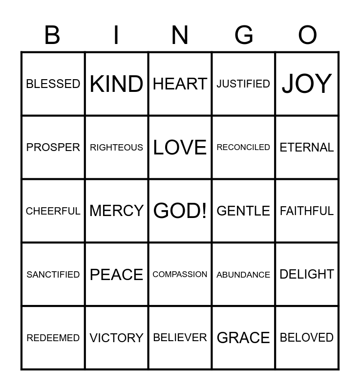 This bingo card has a free space and 24 words: PEACE, VICTORY, LOVE, REDEEMED, JOY, BLESSED, PROSPER, KIND, GENTLE, COMPASSION, RECONCILED, CHEERFUL, ABUNDANCE, DELIGHT, RIGHTEOUS, GRACE, FAITHFUL, HEART, ETERNAL, MERCY, BELOVED, SANCTIFIED, JUSTIFIED and BELIEVER.