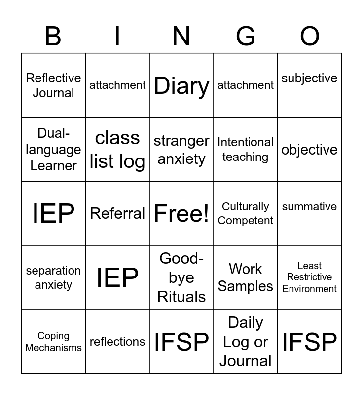 This bingo card has a free space and 24 words: IEP, reflections, stranger anxiety, Coping Mechanisms, subjective, Reflective Journal, Dual-language Learner, attachment, Culturally Competent, Good-bye Rituals, Intentional teaching, IEP, Work Samples, Least Restrictive Environment, class list log, Daily Log or Journal, summative, Diary, objective, Referral, IFSP, separation anxiety, attachment and IFSP.