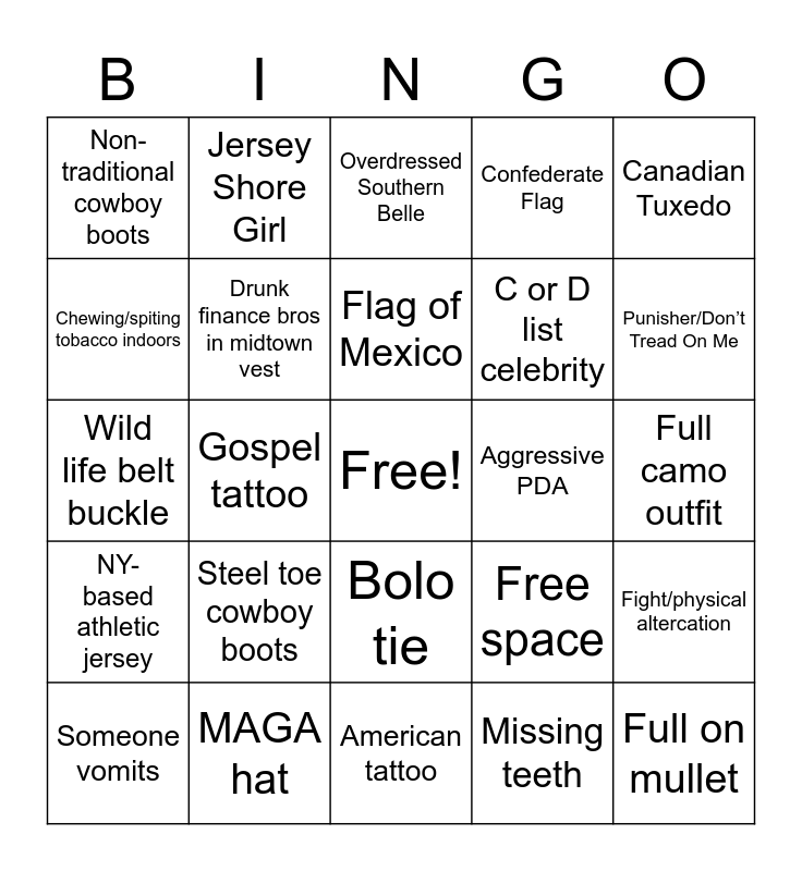 This bingo card has a free space and 25 words: Steel toe cowboy boots, American tattoo, Flag of Mexico, Someone vomits, Canadian Tuxedo, Non-traditional cowboy boots, Chewing/spiting tobacco indoors, Jersey Shore Girl, Aggressive PDA, Bolo tie, C or D list celebrity, Wild life belt buckle, Free space, Fight/physical altercation, Drunk finance bros in midtown vest, Suede jackets with fringe, Full camo outfit, Overdressed Southern Belle, Punisher/Don’t Tread On Me, Gospel tattoo, Full on mullet, MAGA hat, NY-based athletic jersey, Confederate Flag and Missing teeth.