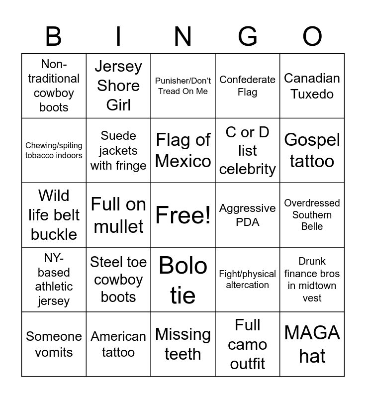 This bingo card has a free space and 24 words: Steel toe cowboy boots, American tattoo, Flag of Mexico, Someone vomits, Canadian Tuxedo, Non-traditional cowboy boots, Chewing/spiting tobacco indoors, Jersey Shore Girl, Aggressive PDA, Bolo tie, C or D list celebrity, Wild life belt buckle, Fight/physical altercation, Drunk finance bros in midtown vest, Suede jackets with fringe, Full camo outfit, Overdressed Southern Belle, Punisher/Don’t Tread On Me, Gospel tattoo, Full on mullet, MAGA hat, NY-based athletic jersey, Confederate Flag and Missing teeth.
