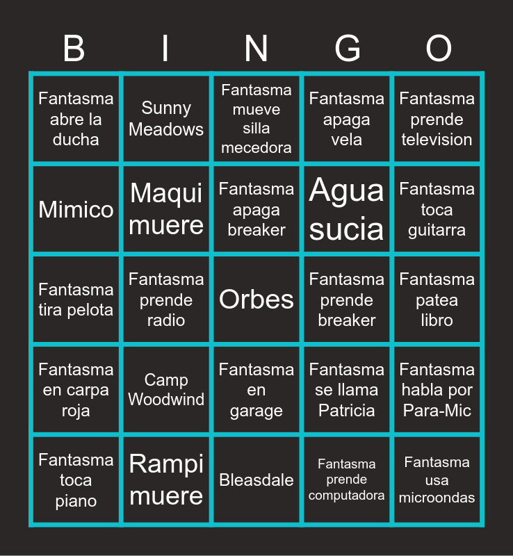 This bingo card has 46 words: D.O.T.S, Orbes, Willow, Bleasdale, Camp Woodwind, Browstone Highschool, Sunny Meadows, Goryo, Mimico, Foto 3 estrellas fantasma, Maqui muere, Fantasma apaga vela, Fantasma habla por Para-Mic, Fantasma se llama Patricia, Fantasma mueve a Marta, Fantasma teletransporta osito, Fantasma apaga breaker, Fantasma prende breaker, Fantasma prende luz, Fantasma prende television, Fantasma prende radio, Fantasma prende computadora, Fantasma abre la ducha, Agua sucia, Fantasma en atico, Fantasma toca guitarra, Fantasma toca piano, Fantasma usa crucifijo, Fantasma en garage, Fantasma en carpa roja, Fantasma en enfermeria, Fantasma en biblioteca, Fantasma en morgue, Fantasma tira sellador, Fantasma tira cuchillo, Rampi muere, Fantasma patea libro, Maqui se asusta, Fantasma toca ventana, Fantasma activa alarma de coche, Fantasma usa microondas, Fantasma mueve silla mecedora, Fantasma tira pelota, Fantasma llama por telefono, Fantasma golpea conservadora and Fantasma tira martillo.
