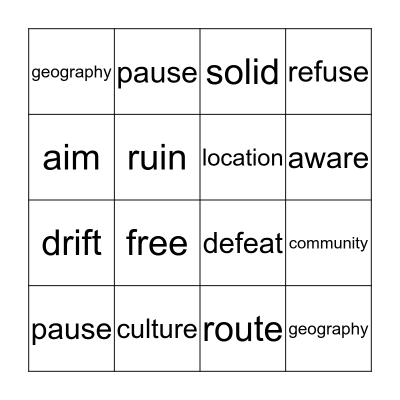 This bingo card has a free space and 15 words: pause, geography, solid, geography, aware, aim, free, route, ruin, drift, community, refuse, location, pause and culture.