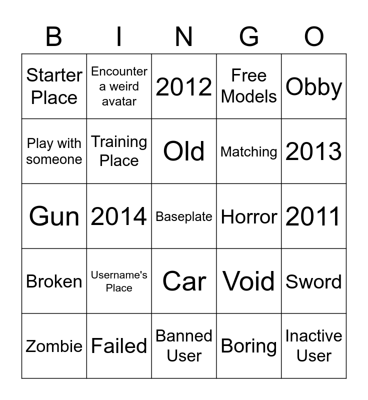This bingo card has a free space and 24 words: Username's Place, Failed, Old, Zombie, Obby, Starter Place, Play with someone, Encounter a weird avatar, Horror, Car, Matching, Gun, Void, Sword, Training Place, Boring, 2011, 2012, 2013, 2014, Inactive User, Broken, Free Models and Banned User.