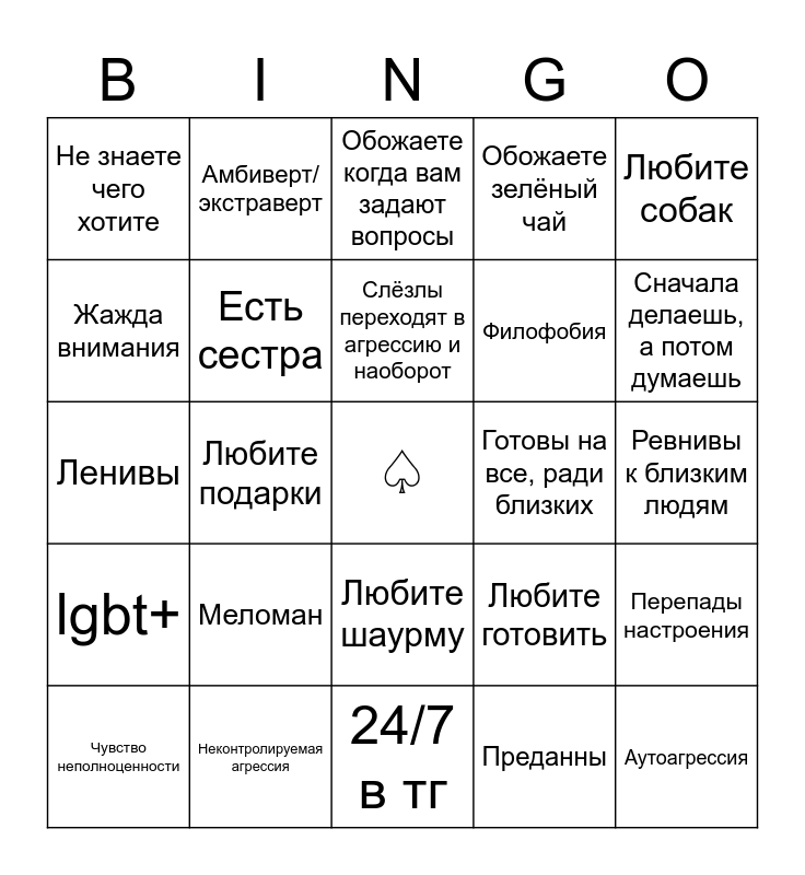 This bingo card has a free space and 24 words: Меломан, Неконтролируемая агрессия, Слёзлы переходят в агрессию и наоборот, Чувство неполноценности, Любите собак, Не знаете чего хотите, Жажда внимания, Амбиверт/экстраверт, Готовы на все, ради близких, Любите шаурму, Филофобия, Ленивы, Любите готовить, Перепады настроения, Есть сестра, Преданны, Ревнивы к близким людям, Обожаете когда вам задают вопросы, Сначала делаешь, а потом думаешь, Любите подарки, Аутоагрессия, lgbt+, Обожаете зелёный чай and 24/7 в тг.