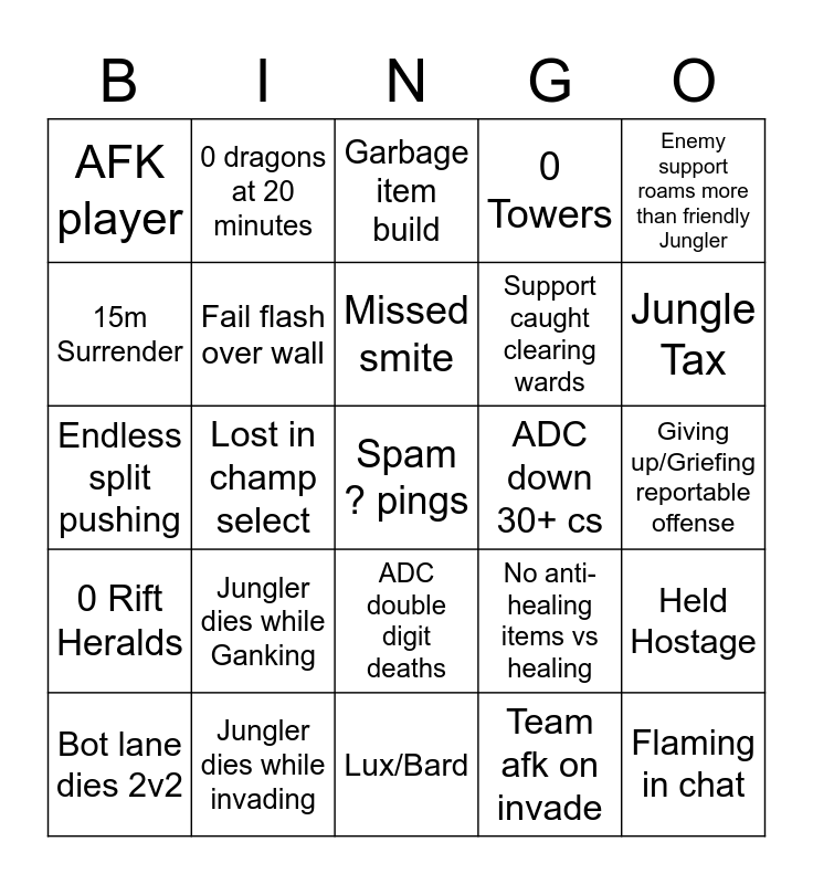 This bingo card has a free space and 24 words: Jungler dies while Ganking, Jungler dies while invading, Missed smite, Bot lane dies 2v2, Enemy support roams more than friendly Jungler, AFK player, 15m Surrender, 0 dragons at 20 minutes, ADC down 30+ cs, ADC double digit deaths, Support caught clearing wards, Endless split pushing, No anti-healing items vs healing, Held Hostage, Fail flash over wall, Team afk on invade, Giving up/Griefing reportable offense, Garbage item build, Jungle Tax, Lost in champ select, Flaming in chat, 0 Rift Heralds, 0 Towers and Lux/Bard.