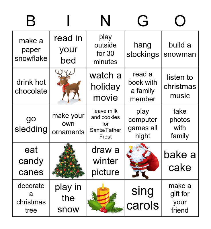 This bingo card has 4 images, a free space and 20 words: play in the snow, watch a holiday movie, decorate a christmas tree, build a snowman, make a paper snowflake, drink hot chocolate, read in your bed, play computer games all night, draw a winter picture, read a book with a family member, go sledding, bake a cake, sing carols, take photos with family, play outside for 30 minutes, listen to christmas music, make your own ornaments, make a gift for your friend, eat candy canes and hang stockings.
