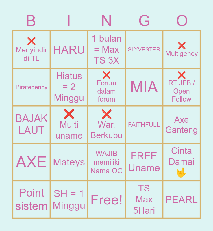 This bingo card has 25 words: AXE, SH = 1 Minggu, โ War, Berkubu, TS Max 5Hari, โ Multigency, โ Menyindir di TL, HARU, 1 bulan = Max TS 3X, FAITHFULL, Cinta Damai ๐ค, Pirategency, Hiatus = 2 Minggu, Free!, FREE Uname, โ RT JFB / Open Follow, Point sistem, โ Multi uname, โ Forum dalam forum, MIA, Axe Ganteng, BAJAK LAUT, Mateys, WAJIB memiliki Nama OC, SLYVESTER and PEARL.