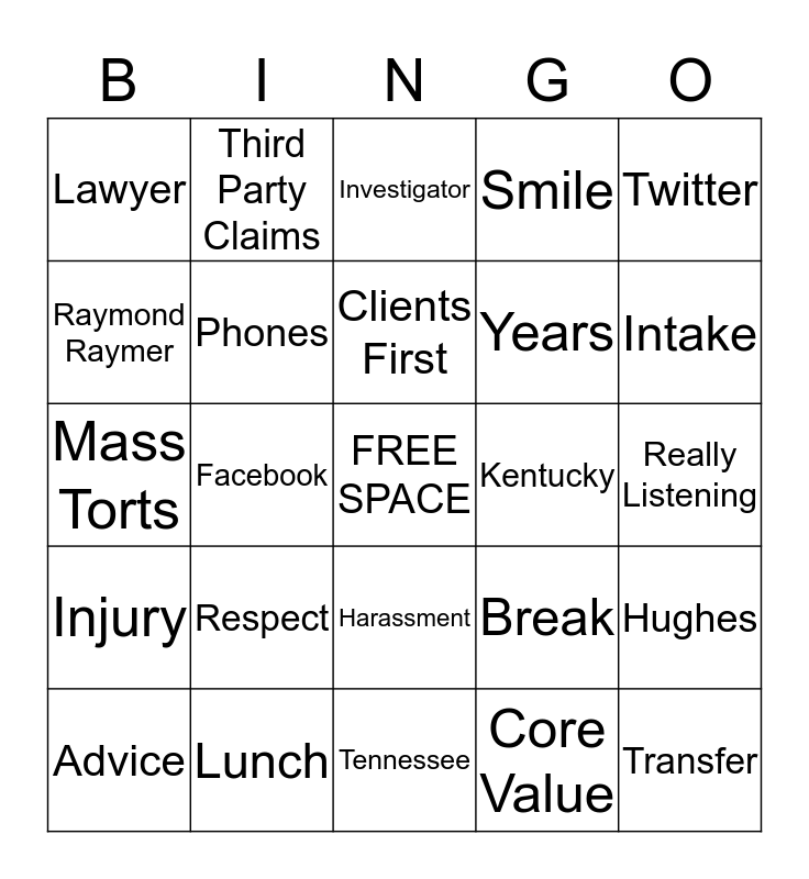 This bingo card has a free space and 26 words: Harassment, Core Value, Clients First, Lunch, Twitter, Lawyer, Raymond Raymer, Third Party Claims, Really Listening, Break, Years, Mass Torts, Hughes, Advice, Facebook, Meeting, Smile, Injury, Investigator, Transfer, Intake, Tennessee, Kentucky, Respect, Phones and Social Security.