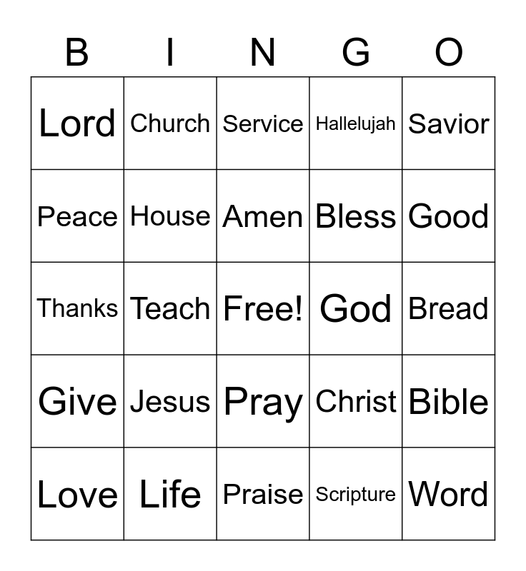 This bingo card has a free space and 24 words: Jesus, Life, Amen, Love, Savior, Lord, Peace, Church, God, Pray, Bless, Thanks, Christ, Bible, House, Scripture, Bread, Service, Good, Teach, Word, Give, Hallelujah and Praise.