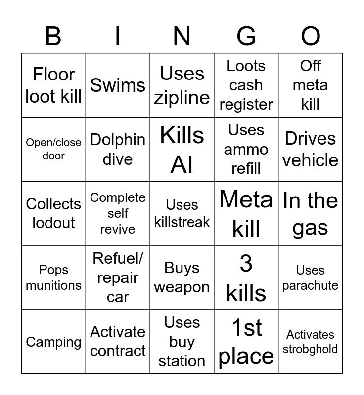 This bingo card has a free space and 24 words: Refuel/ repair car, Activate contract, Kills AI, Camping, Off meta kill, Floor loot kill, Open/close door, Swims, Meta kill, Buys weapon, Uses ammo refill, Collects lodout, 3 kills, Uses parachute, Dolphin dive, 1st place, In the gas, Uses zipline, Drives vehicle, Complete self revive, Activates strobghold, Pops munitions, Loots cash register and Uses buy station.