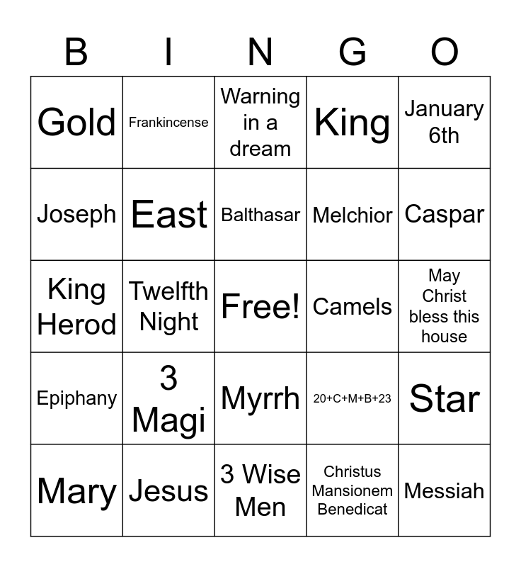 This bingo card has a free space and 24 words: 3 Magi, Jesus, Balthasar, Mary, January 6th, Gold, Joseph, Frankincense, Camels, Myrrh, Melchior, King Herod, 20+C+M+B+23, Star, East, Christus Mansionem Benedicat, May Christ bless this house, Warning in a dream, Caspar, Twelfth Night, Messiah, Epiphany, King and 3 Wise Men.