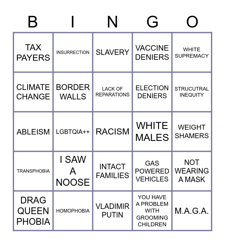 This bingo card has a free space and 24 words: I SAW A NOOSE, HOMOPHOBIA, LACK OF REPARATIONS, DRAG QUEEN PHOBIA, WHITE SUPREMACY, TAX PAYERS, CLIMATE CHANGE, INSURRECTION, WHITE MALES, INTACT FAMILIES, ELECTION DENIERS, ABLEISM, GAS POWERED VEHICLES, NOT WEARING A MASK, BORDER WALLS, YOU HAVE A PROBLEM WITH GROOMING CHILDREN, WEIGHT SHAMERS, SLAVERY, STRUCUTRAL INEQUITY, LGBTQIA++, M.A.G.A., TRANSPHOBIA, VACCINE DENIERS and VLADIMIR PUTIN.