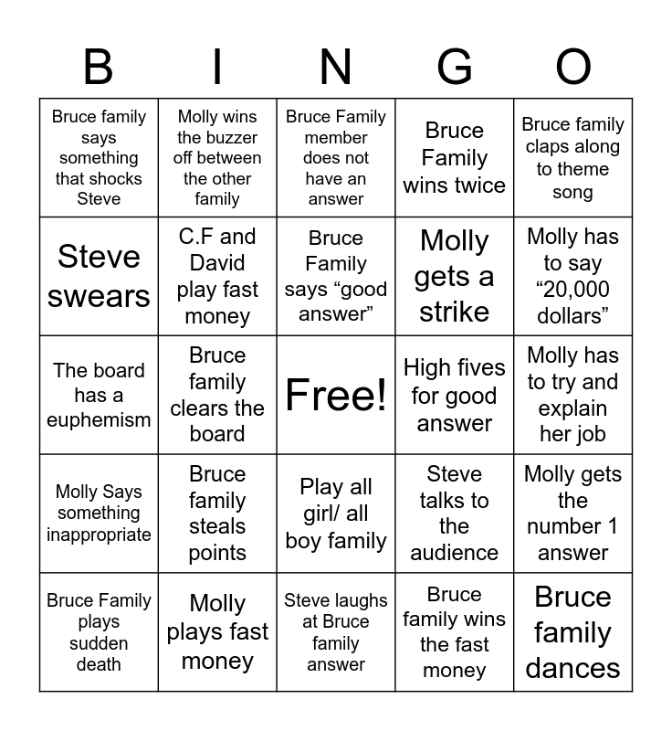 This bingo card has a free space and 24 words: Bruce family steals points, Molly plays fast money, Bruce Family says “good answer”, Bruce Family plays sudden death, Bruce family claps along to theme song, Bruce family says something that shocks Steve, Steve swears, Molly wins the buzzer off between the other family, High fives for good answer, Play all girl/ all boy family, Molly gets a strike, The board has a euphemism, Steve talks to the audience, Molly gets the number 1 answer, C.F and David play fast money, Bruce family wins the fast money, Molly has to try and explain her job, Bruce Family member does not have an answer, Molly has to say “20,000 dollars”, Bruce family clears the board, Bruce family dances, Molly Says something inappropriate, Bruce Family wins twice and Steve laughs at Bruce family answer.