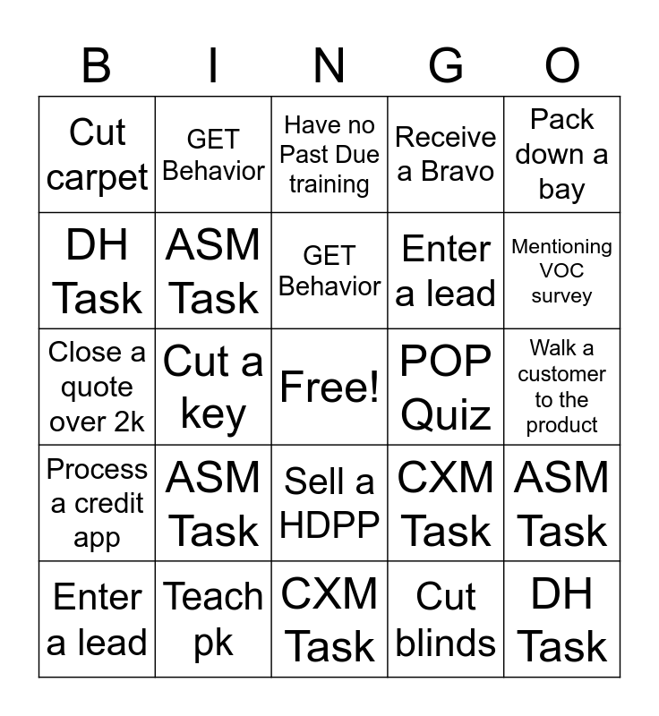 This bingo card has a free space and 52 words: DH Task, DH Task, ASM Task, CXM Task, ASM Task, CXM Task, GET Behavior, POP Quiz, DH Task, DH Task, ASM Task, CXM Task, ASM Task, CXM Task, GET Behavior, POP Quiz, GET Behavior, POP Quiz, Use Sidekick, Pack down a bay, Cut a key, Cut blinds, Cut carpet, Enter a lead, Load a customer, Help a customer in another dept, Face an endcap, Customer praise, Mentioning VOC survey, Cart run, Hand out a Bravo, Receive a Bravo, Help in another dept, Help in another dept, Have Infocus completed, Have no Past Due training, Teach pk, Learn pk, POP Quiz, Sign Safety Pledge, Complete Safety Experience QR code, Walk a customer to the product, Process a credit app, Sell a measure, Sell a HDPP, Close any quote, Close a quote over 5k, Close a quote over 2k, Call the credit center, Call an installer/vendor, Enter a lead and Sell a measure.