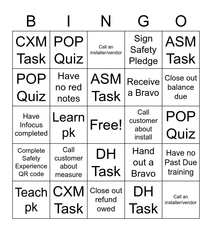 This bingo card has a free space and 26 words: DH Task, DH Task, ASM Task, CXM Task, ASM Task, CXM Task, POP Quiz, POP Quiz, POP Quiz, Hand out a Bravo, Receive a Bravo, Have Infocus completed, Have no Past Due training, Teach pk, Learn pk, POP Quiz, Sign Safety Pledge, Complete Safety Experience QR code, Call an installer/vendor, Call an installer/vendor, Close out balance due, Close out refund owed, Call customer about install, Call customer about measure, Have no red notes and Have no red quotes.