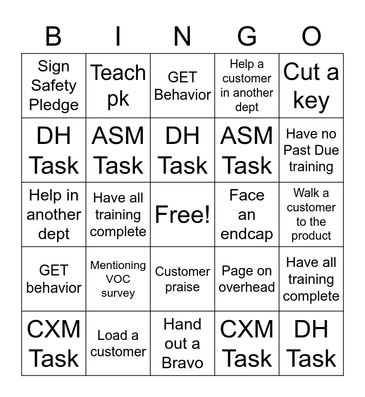 This bingo card has a free space and 45 words: DH Task, DH Task, ASM Task, CXM Task, ASM Task, CXM Task, GET Behavior, POP Quiz, Cut a key, Load a customer, Help a customer in another dept, Face an endcap, Customer praise, Mentioning VOC survey, Cart run, Hand out a Bravo, Receive a Bravo, Help in another dept, Have Infocus completed, Have no Past Due training, Teach pk, Learn pk, POP Quiz, Sign Safety Pledge, Complete Safety Experience QR code, Walk a customer to the product, Fill out safety bravo, Load customer, Page on overhead, GET behavior, POP Quiz, Have all training complete, Pull a BOPIS, Pull a will call, Pull a delivery, Have all training complete, Pull a BOPIS, Pull a will call, Pull a delivery, DH Task, DH Task, ASM Task, CXM Task, ASM Task and CXM Task.