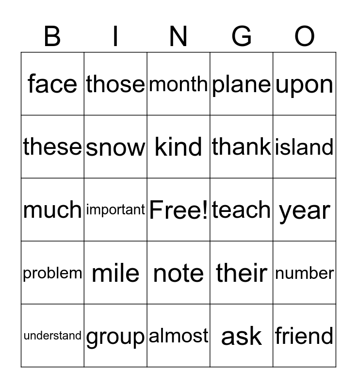 This bingo card has a free space and 24 words: mile, group, kind, understand, upon, face, these, those, teach, note, thank, much, their, number, snow, ask, year, month, island, important, friend, problem, plane and almost.