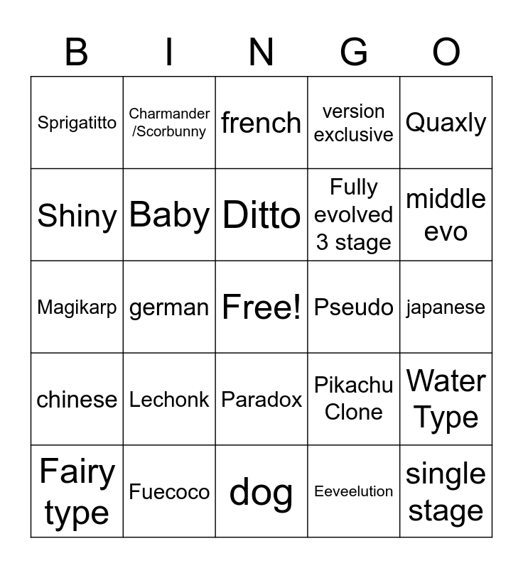 This bingo card has a free space and 24 words: Lechonk, Fuecoco, Ditto, Fairy type, Quaxly, Sprigatitto, Shiny, Charmander /Scorbunny, Pseudo, Paradox, Fully evolved 3 stage, Magikarp, Pikachu Clone, Water Type, Baby, Eeveelution, japanese, french, middle evo, german, single stage, chinese, version exclusive and dog.