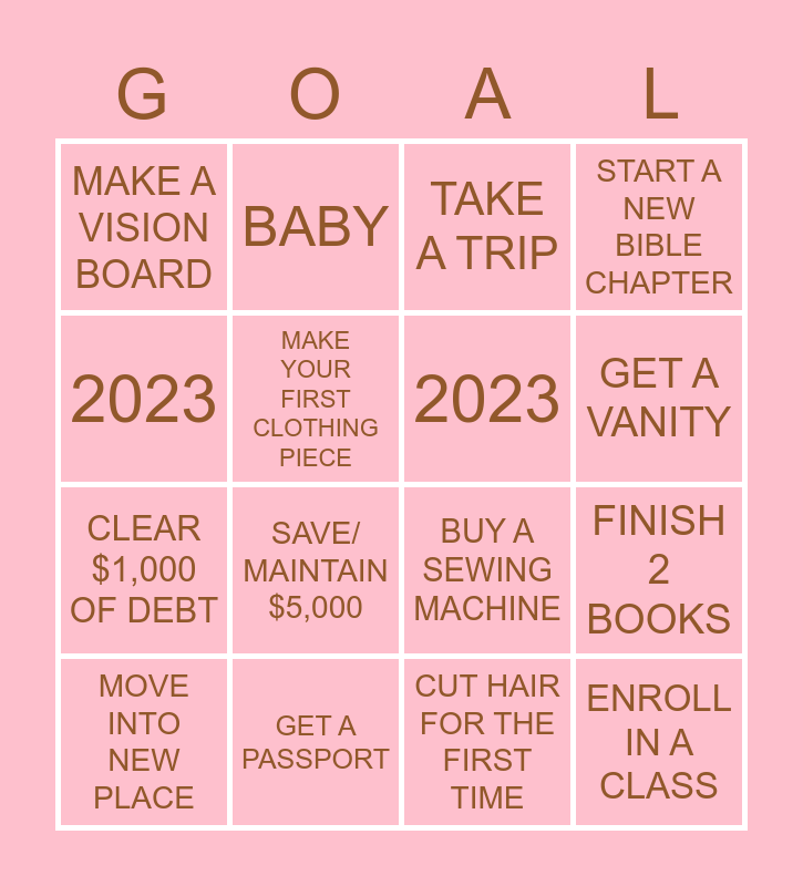 This bingo card has 16 words: GET A PASSPORT, FINISH 2 BOOKS, TAKE A TRIP, MAKE A VISION BOARD, CLEAR $1,000 OF DEBT, BABY, BUY A SEWING MACHINE, CUT HAIR FOR THE FIRST TIME, 2023, MAKE YOUR FIRST CLOTHING PIECE, MOVE INTO NEW PLACE, START A NEW BIBLE CHAPTER, SAVE/ MAINTAIN $5,000, GET A VANITY, 2023 and ENROLL IN A CLASS.