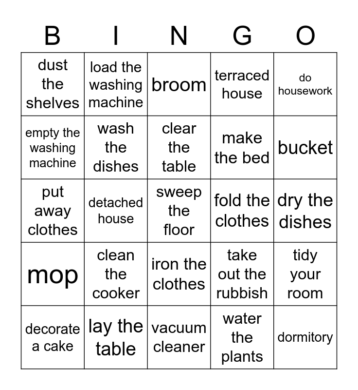 This bingo card has a free space and 24 words: clean the cooker, lay the table, clear the table, decorate a cake, do housework, dust the shelves, empty the washing machine, load the washing machine, fold the clothes, iron the clothes, make the bed, put away clothes, take out the rubbish, tidy your room, wash the dishes, water the plants, dry the dishes, broom, bucket, detached house, dormitory, mop, terraced house and vacuum cleaner.