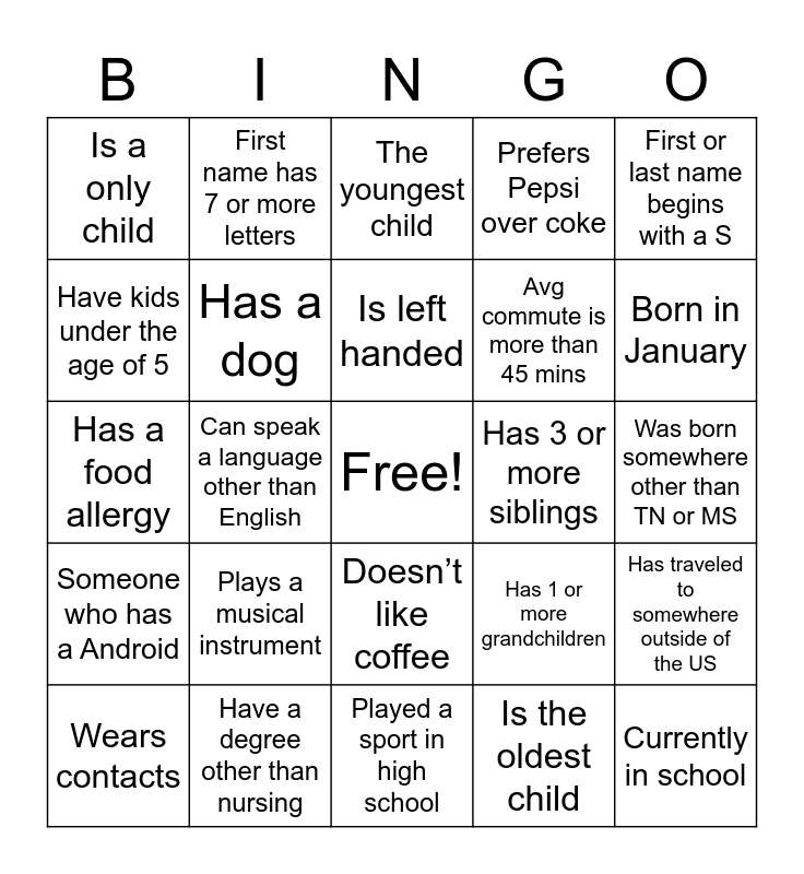 This bingo card has a free space and 24 words: Plays a musical instrument, Have a degree other than nursing, Is left handed, Wears contacts, First or last name begins with a S, Is a only child, Have kids under the age of 5, First name has 7 or more letters, Has 3 or more siblings, Doesn’t like coffee, Avg commute is more than 45 mins, Has a food allergy, Has 1 or more grandchildren, Has traveled to somewhere outside of the US, Has a dog, Is the oldest child, Was born somewhere other than TN or MS, The youngest child, Born in January, Can speak a language other than English, Currently in school, Someone who has a Android, Prefers Pepsi over coke and Played a sport in high school.