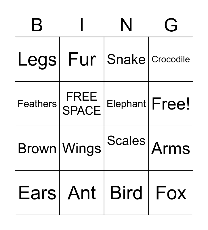 This bingo card has 17 words: Bird, Ears, Snake, Legs, Wings, Crocodile, Arms, Elephant, Free!, FREE SPACE, Ant, Scales, Feathers, Fur, Brown, Tail and Fox.