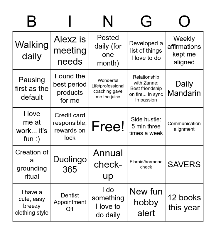 This bingo card has a free space and 24 words: Duolingo 365, Dentist Appointment Q1, Wonderful Life/professional coaching gave me the juice, I have a cute, easy breezy clothing style, Weekly affirmations kept me aligned, Walking daily, Pausing first as the default, Alexz is meeting needs, Side hustle: 5 min three times a week, Annual check-up, Relationship with Zanne: Best friendship on fire... In sync In passion, I love me at work... it's fun :), Fibroid/hormone check, SAVERS, Found the best period products for me, New fun hobby alert, Communication alignment, Posted daily (for one month), Daily Mandarin, Credit card responsible, rewards on lock, 12 books this year, Creation of a grounding ritual, Developed a list of things I love to do and I do something I love to do daily.