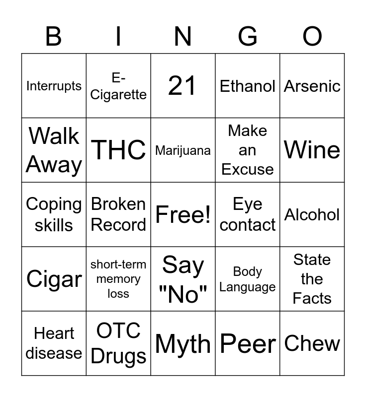 This bingo card has a free space and 34 words: Addiction, Peer, Nicotine, Peer Pressure, Cigar, THC, Arsenic, Heart disease, E- Cigarette, Advertising, Marijuana, 21, Yourself, Goal, Eye contact, Wine, OTC Drugs, Coping skills, short-term memory loss, Body Language, Say "No", Ignore, Interrupts, Alcohol, Myth, Chew, Ethanol, Better Idea, Make an Excuse, Walk Away, Steer Clear, Broken Record, State the Facts and Reverse the Pressure.