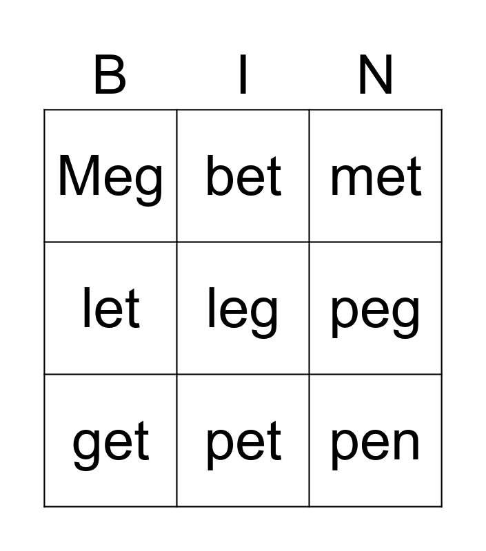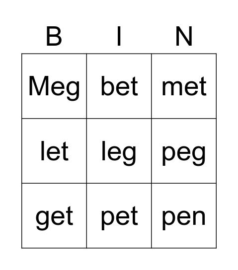 This bingo card has 10 words: pet, met, Meg, leg, let, get, bet, beg, peg and pen.