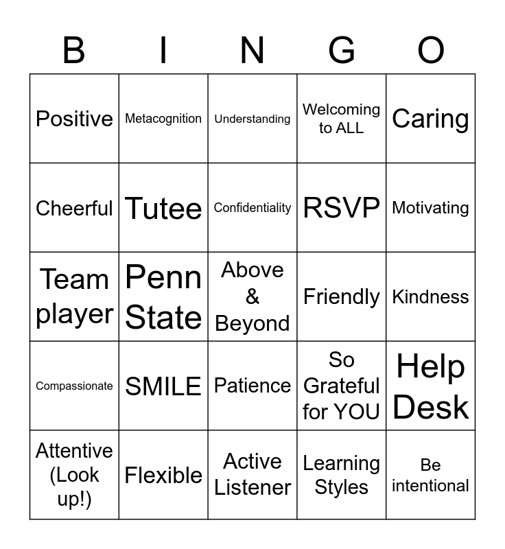 Tutor Training Orientation Bingo! | Nittany Success Center | Nittany Success Center | BINGO | finals week