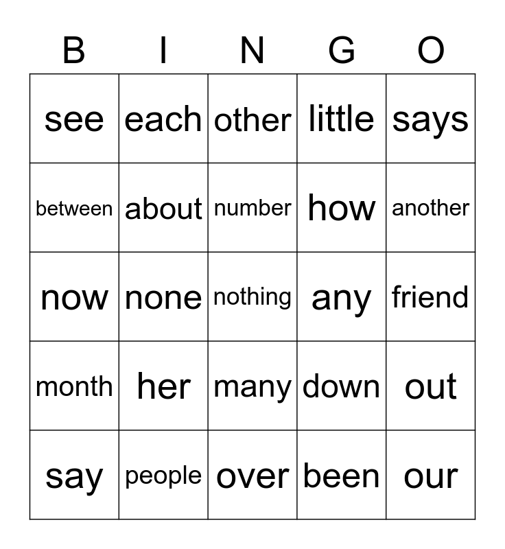 This bingo card has 25 words: her, over, number, say, says, see, between, each, any, many, how, now, down, out, about, our, friend, other, another, none, nothing, people, month, little and been.