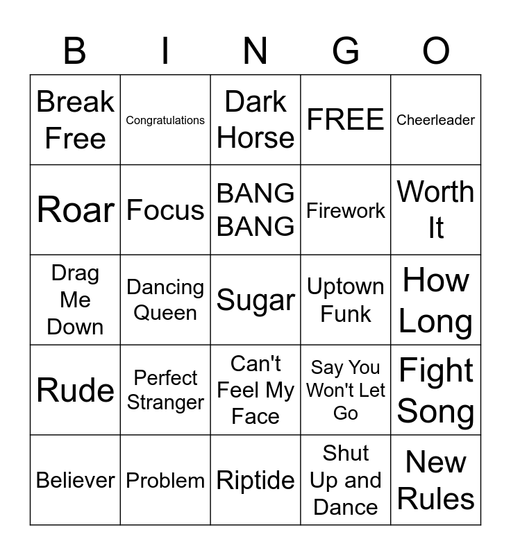 This bingo card has 25 words: Perfect Stranger, Riptide, BANG BANG, Believer, Cheerleader, Break Free, Roar, Congratulations, Uptown Funk, Can't Feel My Face, Firework, Drag Me Down, Say You Won't Let Go, Fight Song, Focus, New Rules, How Long, Dark Horse, Worth It, Dancing Queen, Sugar, Problem, Rude, FREE and Shut Up and Dance.