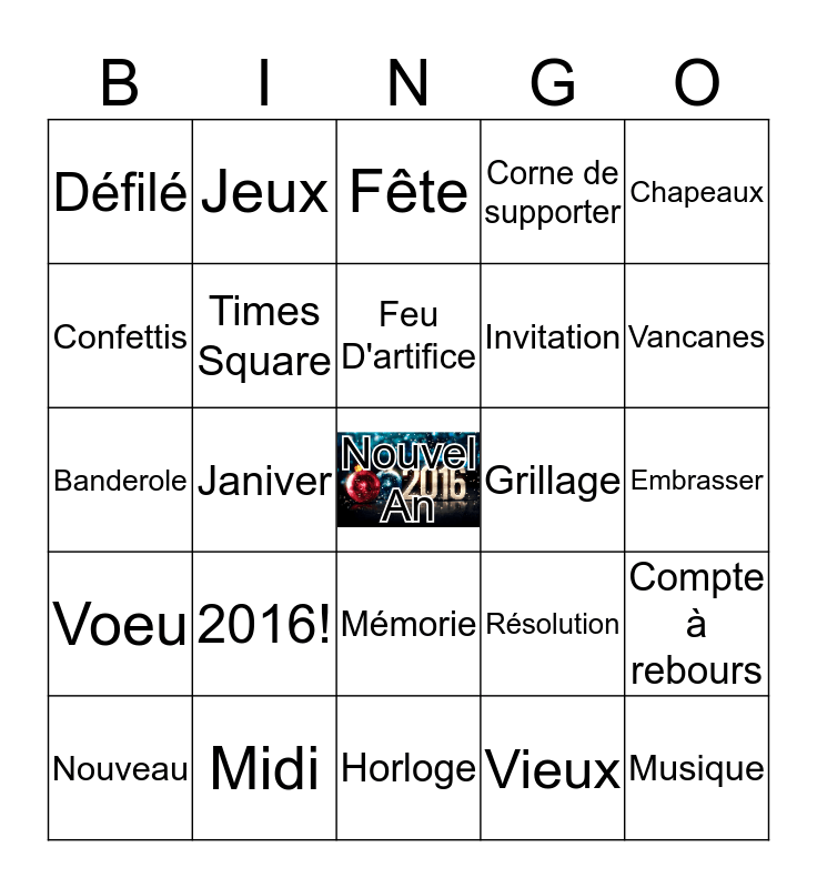 This bingo card has a free space and 24 words: 2016!, Midi, Feu D'artifice, Nouveau, Chapeaux, Défilé, Confettis, Jeux, Grillage, Mémorie, Invitation, Banderole, Résolution, Compte à rebours, Times Square, Vieux, Embrasser, Fête, Vancanes, Janiver, Musique, Voeu, Corne de supporter and Horloge.