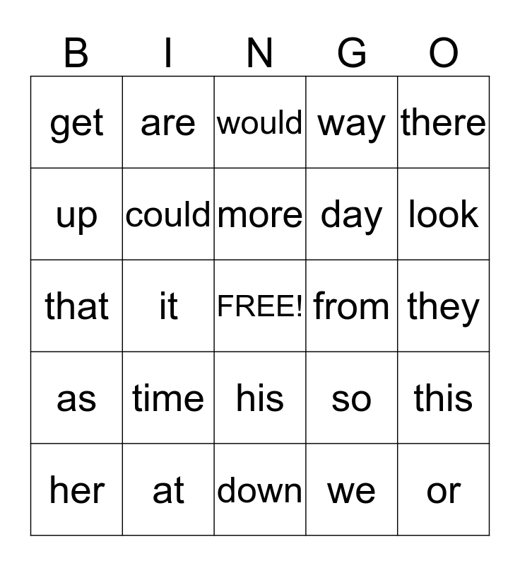 This bingo card has a free space and 32 words: we, who, it, each, as, could, there, this, are, been, more, would, in, be, from, first, her, that, his, time, so, come, they, at, or, way, day, up, get, down, you and look.