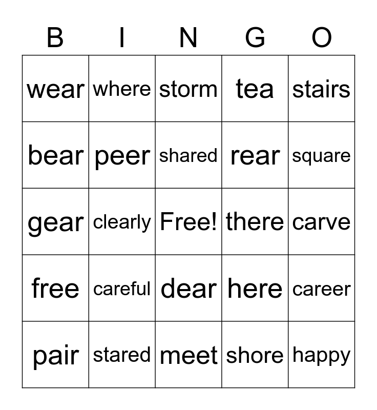 This bingo card has a free space and 24 words: careful, stared, shared, pair, stairs, wear, bear, where, there, dear, rear, gear, here, career, peer, shore, carve, storm, square, clearly, happy, free, tea and meet.