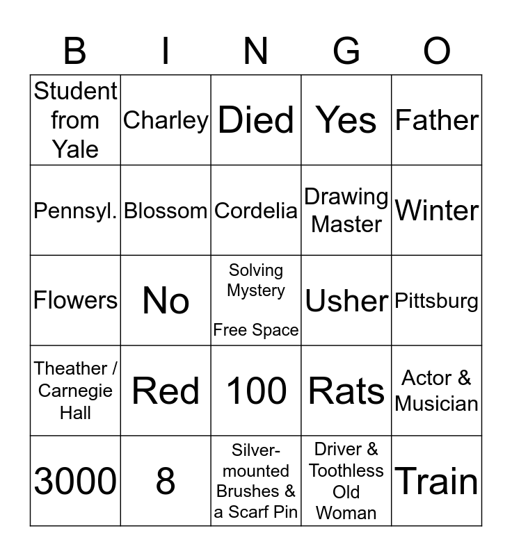 This bingo card has a free space and 24 words: Red, 8, Cordelia, 3000, Father, Student from Yale, Pennsyl., Charley, Usher, 100, Drawing Master, Flowers, Rats, Actor & Musician, Blossom, Driver & Toothless Old Woman, Pittsburg, Died, Winter, No, Train, Theather / Carnegie Hall, Yes and Silver-mounted Brushes & a Scarf Pin.