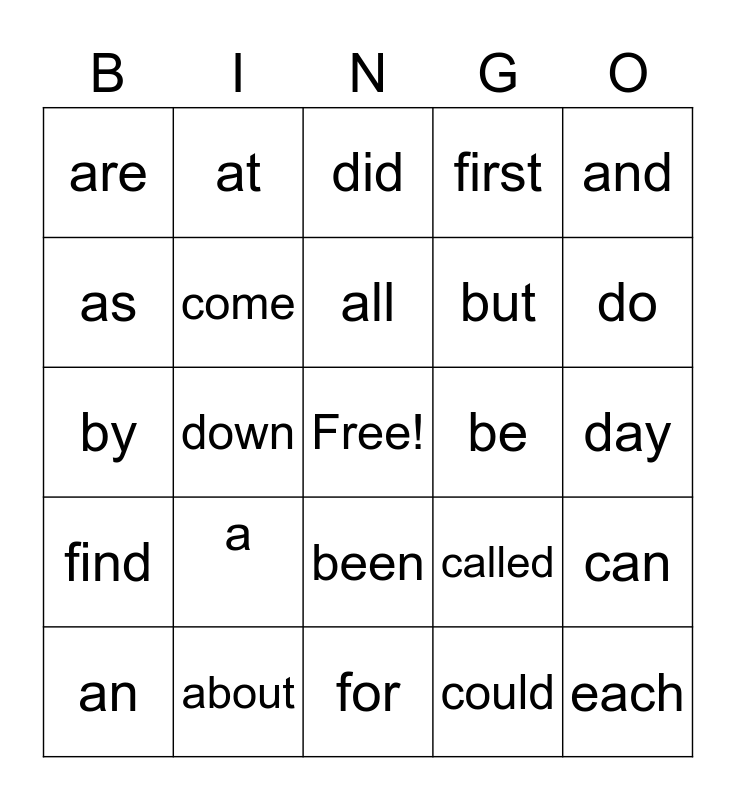 This bingo card has a free space and 24 words: a, about, all, an, and, are, as, at, be, been, but, by, called, can, come, could, day, did, do, down, each, find, first and for.