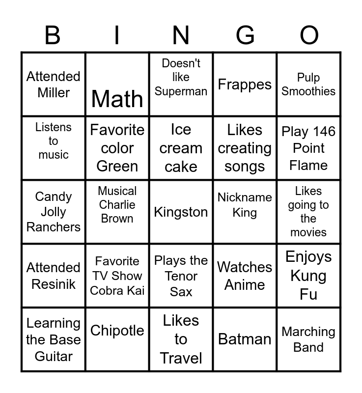 This bingo card has a free space and 54 words: Jazz Band, Attended Resinik, Wants to go to Hollywood, Likes to play XBox, Plays the Tenor Sax, Chick-Fil-A, Frappes, Learning the Acoustic Guitar, Listens to music, Firestone Theatre, Attended Miller, Likes hanging out w/friends, Chipotle, Learning the Base Guitar, Plays the Alto Sax, Likes to Travel, Marching Band, Likes creating songs, Only Child, Likes going to the movies, Watches Anime, Marshmallows, Nickname King, Pulp Smoothies, Tacos, Math, Bruno Mars, Drake, Favorite Song Finish Line, Batman, Takis, Doesn't Like Marvel, Favorite cartoon Ben 10, Anime Chainsaw Man, Doesn't like Superman, DC, Candy Jolly Ranchers, Enjoys Kung Fu, Favorite Youtuber CoryXKenshin, Favorite color Green, Favorite Movie Series Transformers, Pizza, Favorite food Chinese, Sushi, Favorite TV Show Cobra Kai, Apex, Avatar the The Last Airbender, Pumpkin Pie, Ice cream cake, Musical Charlie Brown, Play 146 Point Flame, Youtuber D'Aydrian Harding, Doesn't Like PS4 and Likes showing out.
