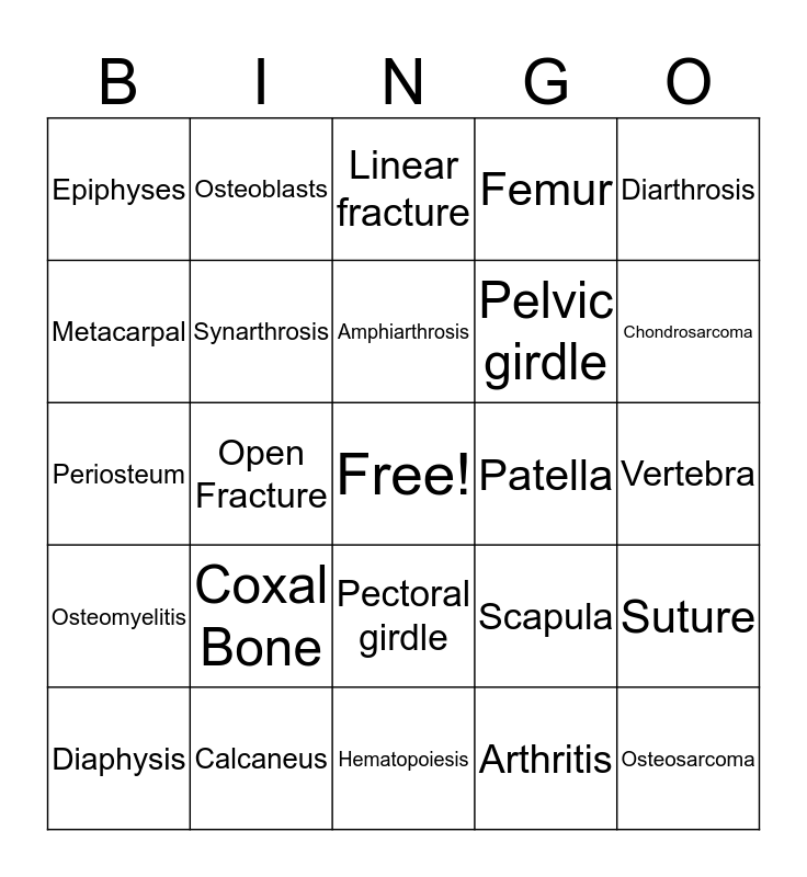 This bingo card has a free space and 24 words: Coxal Bone, Calcaneus, Amphiarthrosis, Diaphysis, Diarthrosis, Epiphyses, Metacarpal, Osteoblasts, Patella, Pectoral girdle, Pelvic girdle, Periosteum, Scapula, Suture, Synarthrosis, Arthritis, Vertebra, Linear fracture, Chondrosarcoma, Open Fracture, Osteosarcoma, Osteomyelitis, Femur and Hematopoiesis.